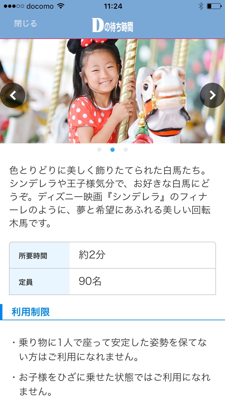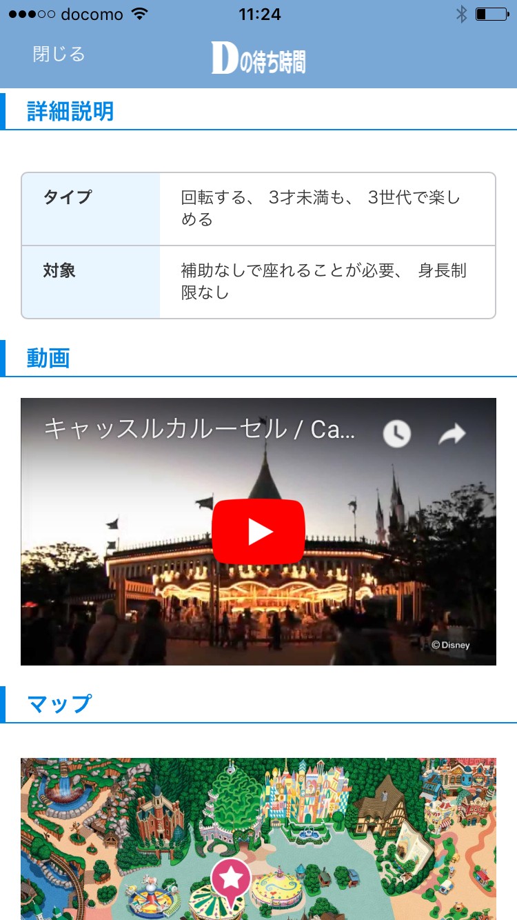 気になるアトラクションを見つけたらタップしてみましょう。今回は小さな子供も一緒・・・という体で「キャッスルカルーセル」を見てみます。
