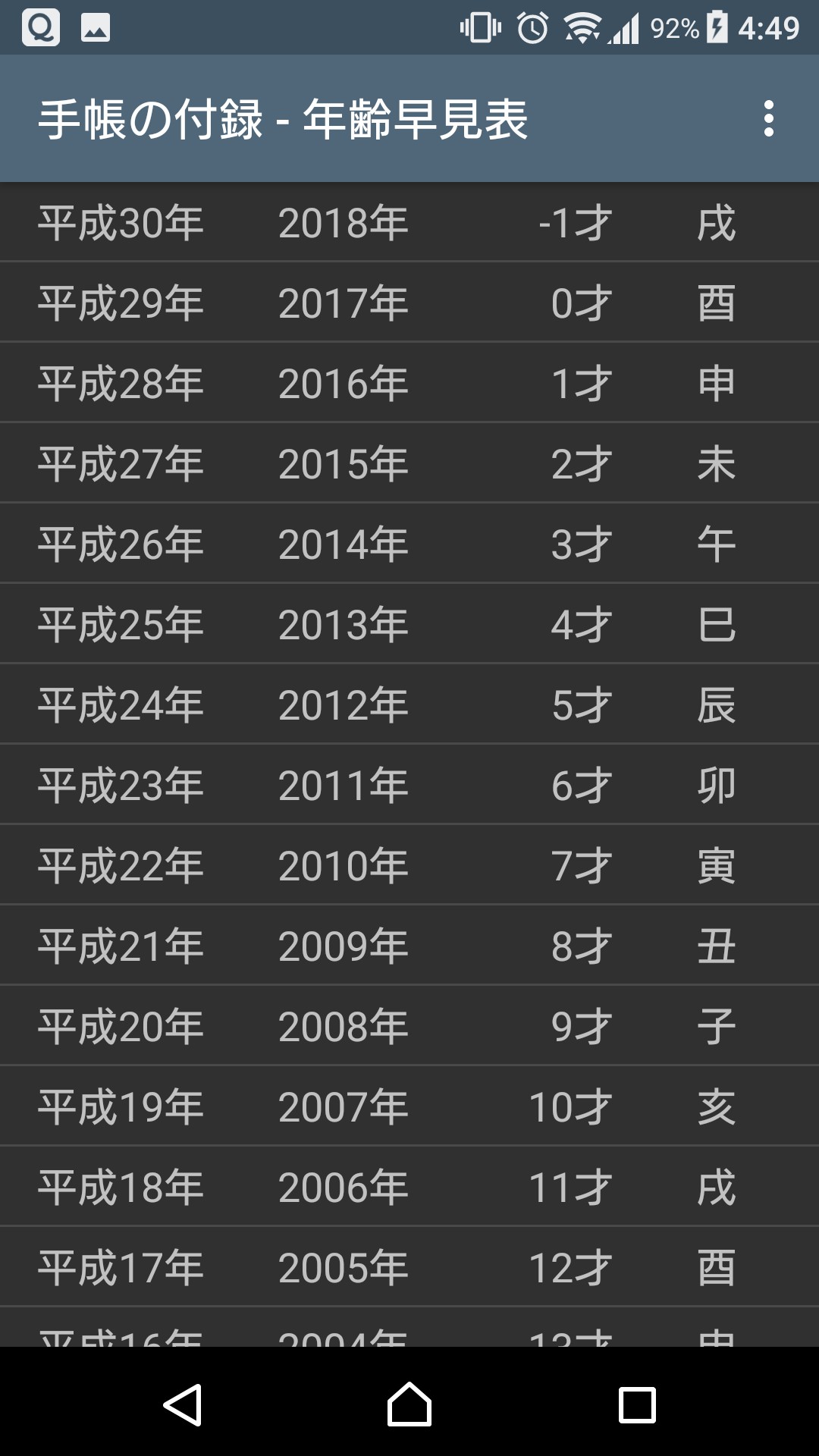 ・年齢早見表で、生まれ年の年号、西暦、干支がわかる