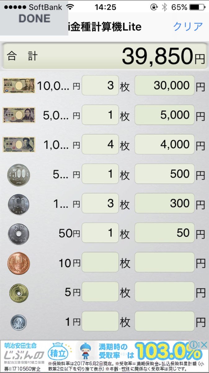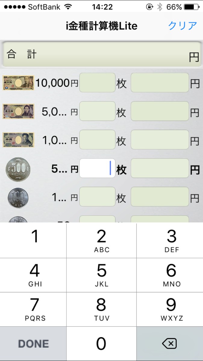2.操作方法は、1円から1万円まで各硬化・紙幣の項目に枚数を入力していくだけです。テンキーで入力した後「DONE」を押すか、テンキー以外の場所を押すと入力できます。入力するとすぐ金額が表示され、合計金額にも反映されます。実際にフリマに出店した際「i金種計算機Lite」を使用しましたが、お金の種類ごとに枚数を入力するだけなので精算がとても楽でした。