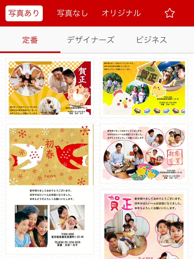 「しまうま年賀状2017 スマホ写真で簡単注文」では、定番デザインからデザイナーズ・ビジネス・結婚・出産・引越など素敵なデザインテンプレートが豊富に用意されています。