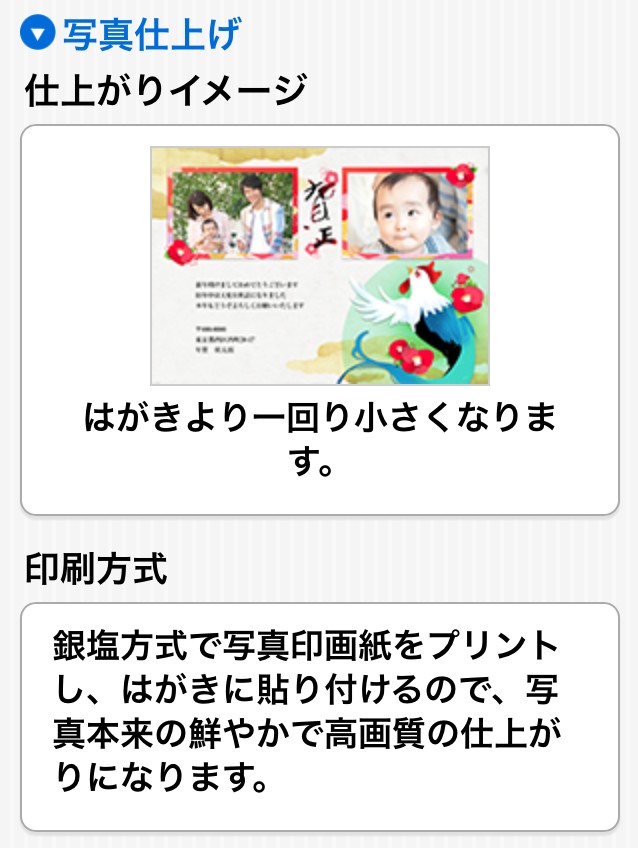 「写真仕上げ」では、より鮮やかで高画質な写真をハガキに貼り付けます。