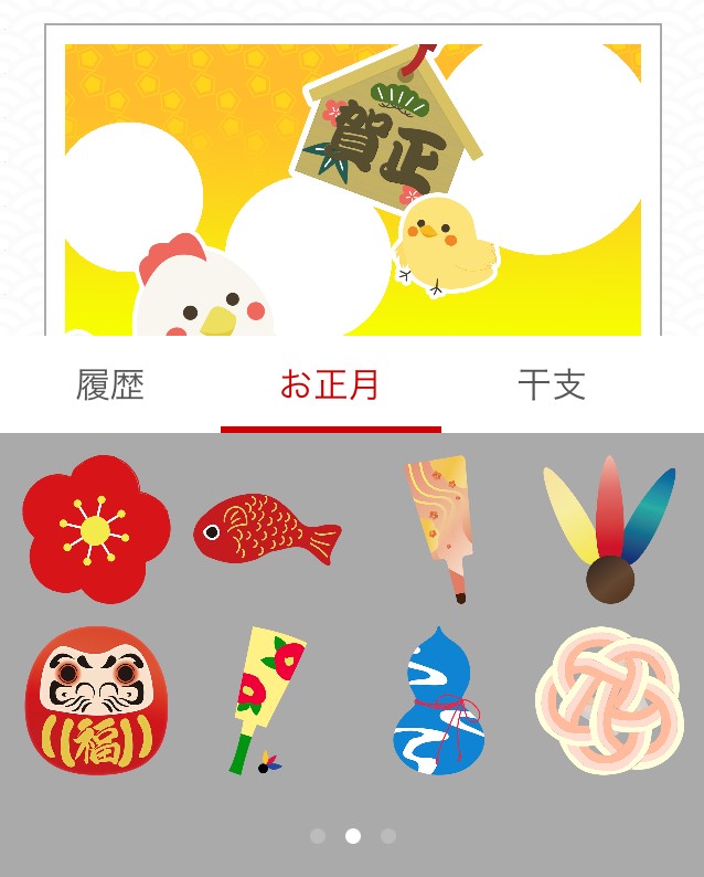 テンプレート上にはスマホに保存している写真をたくさん使用することができ、賑やかな年賀状を作成することができます。