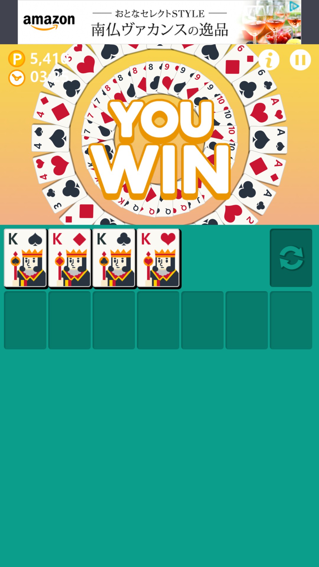 全てのカードを上部の4つのマスに順番に収めることが出来るとクリアなのですが、下の部分でキングから順番に並べられた時点でオートでクリアにすることも出来ます。