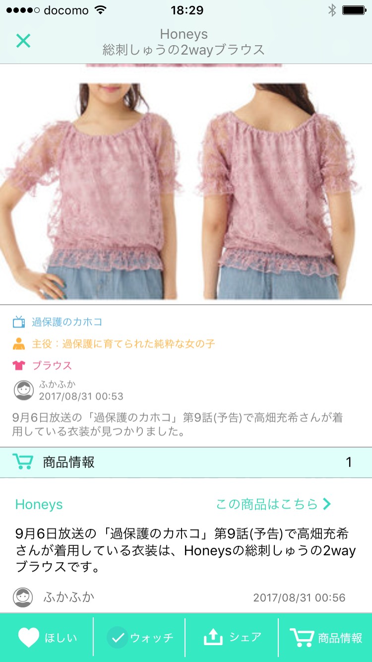 ではでは気になる洋服をタップしてみましょう。こちらは、次回放送の「過保護のカホコ」予告で高畑充希さんが着ていた洋服のようです!この画面から販売サイトを開くこともできるので即購入もできますよ!ちなみにこちらの洋服、意外にもリーズナブル!!