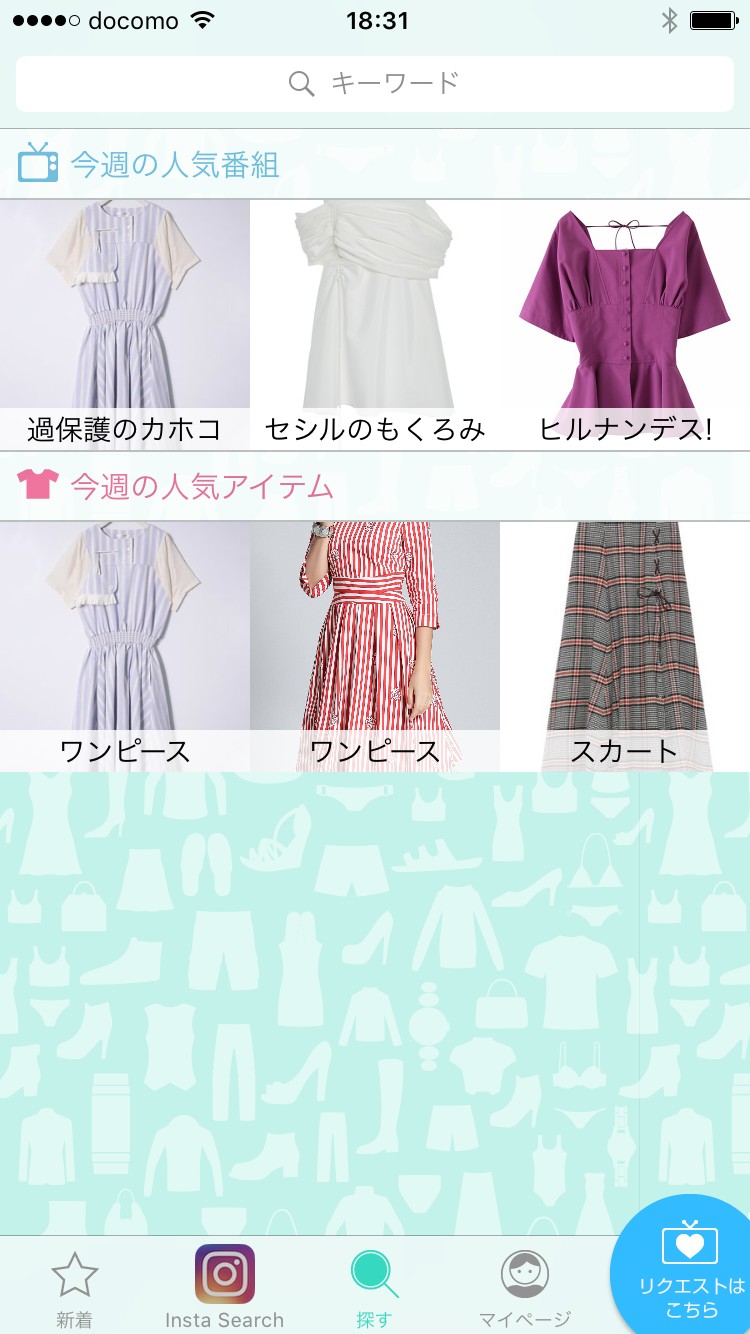 トップ画面の「探す」をタップすると人気番組、人気アイテムが表示されます。これで流行ファッションがチェックできますね♪最近では「過保護のカホコ」人気が半端ないですね~。