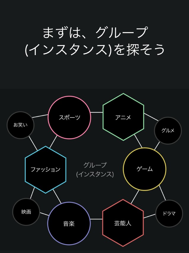 「ファッション」や「音楽」、「スポーツ」、「アニメ、「ゲーム」などのテーマからさらに枝分れしてグループが作られており、自分が好きなまたは興味あるグループへの参加が可能です。