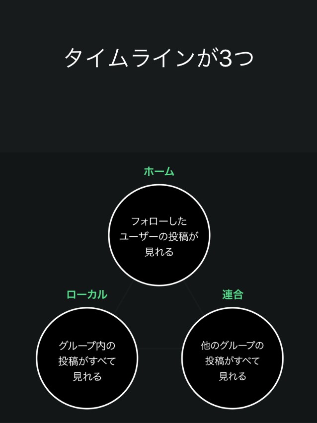 ホームでは、マストドンでフォローしたユーザーの投稿をみることができます。
