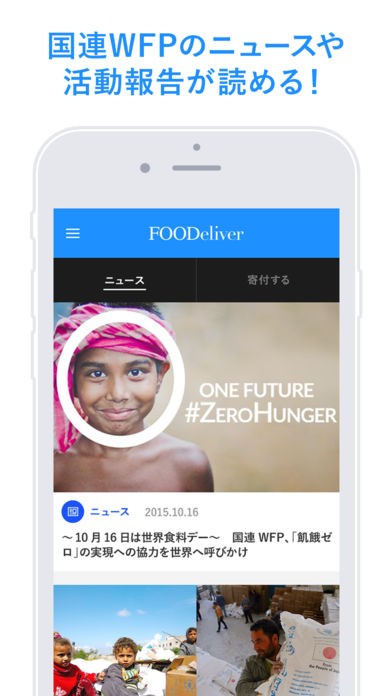 「FOODeliver」は世界中の様々な災害や紛争などで、食料の危機に直面している多くの市民に2日間、48時間以内にまず命を守る為の食料を届けるという使命をになう国連WHPの公式アプリです。毎日多くの危機が世界で起こっている、でも自分が何か出来ることって何だろう?そういう思いを形にして、しかも時間も手続きもなく即「援助」することを可能にしたのが「FOODeliver」です。毎日の自分の生活に埋もれるうちに、「何かしたい」そういう思いも埋もれてしまっている、そう感じている人はぜひこの「FOODeliver」を活用して下さい。あなたの思いが2日間以内に形となって世界の飢えている状況の人に届くのです。行動するならば「今」です。