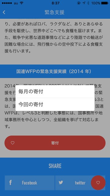 スマホから簡単に寄付ができます。「FOODeliver」画面上部の(寄付をする)をタップすると、緊急支援、学校給食、母子栄養のそれぞれの用途別に支援ができます。支援ごとの活動内容も分かりますので、寄付したい活動をしっかり選べます。支援は毎月行う、今回のみ寄付(その都度)のどちらか選べます。そうした寄付をする際に自分のアカウントを作成しておけば、これまでの寄付の履歴をチェックすることができます。そして支援が必要とされる緊急事態が起きると通知が届くようになります。熊本地震の支援として募金が行われているようですので、みなさんの一歩の行動が待たれます。ぜひとも参加ください。「FOODeliver」を活用して下さい。