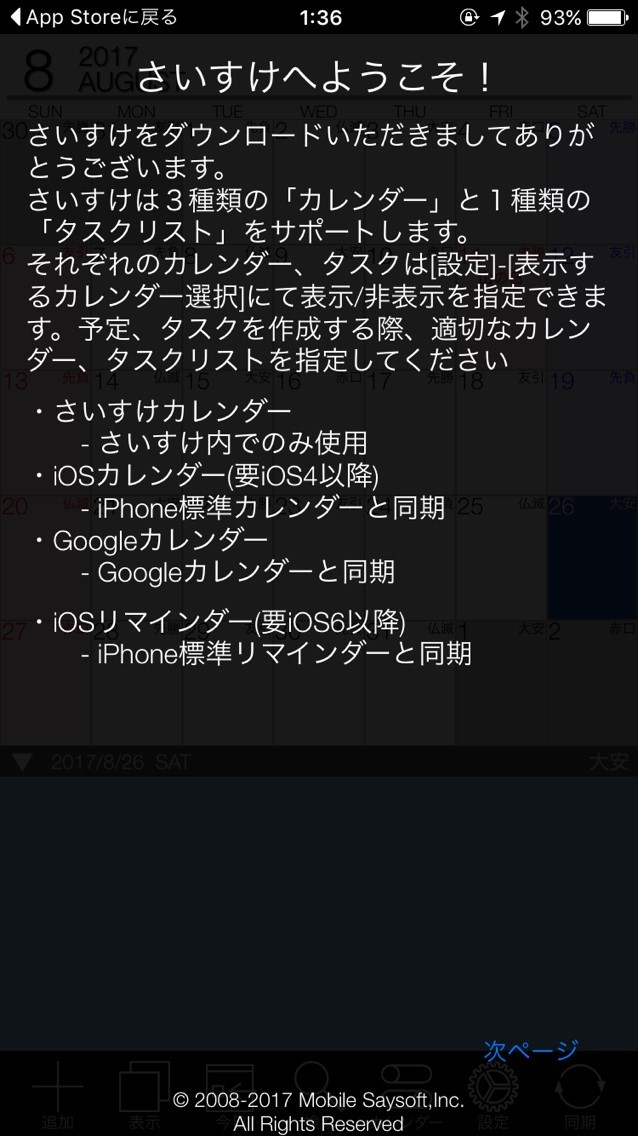 1.起動後、アプリが同期するカレンダーについての説明が表示される。確認後「次ページ」をタップ