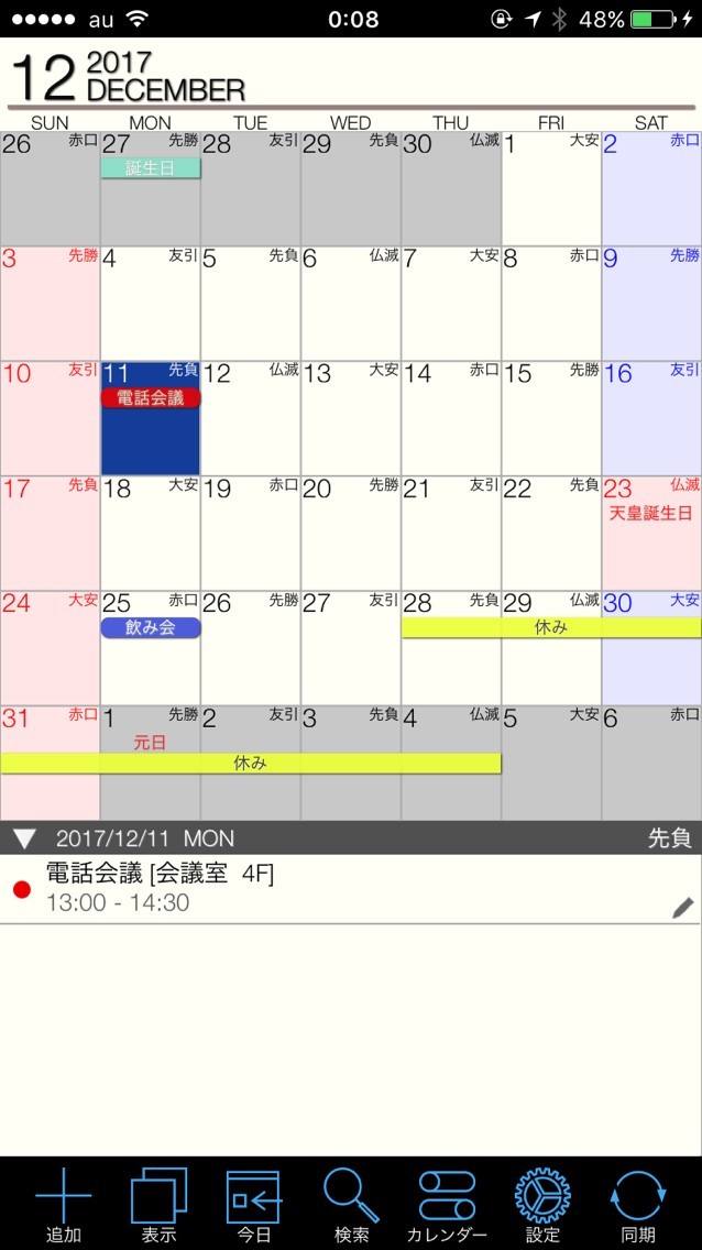 以上の操作で簡単に予定を入力することができました。「手順5」の予定入力の際、画面右上の「詳細」を選択すれば、イベントの終了時間やメモ、マーカー色の変更などより細かな設定を行うことができます。また、一度入力した予定を訂正したい場合は、該当日をタップして、画面下部に表示されるメモを選択すると、詳しいメモが表示され、そこから訂正などの編集を行うことが可能です。