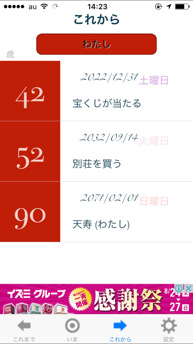 ・「天寿」で、自分の人生が終わる日を登録します。もちろん先のことはわからないので、自分の想像で構いません。「この年までは生きたい」と思う年齢で良いでしょう。