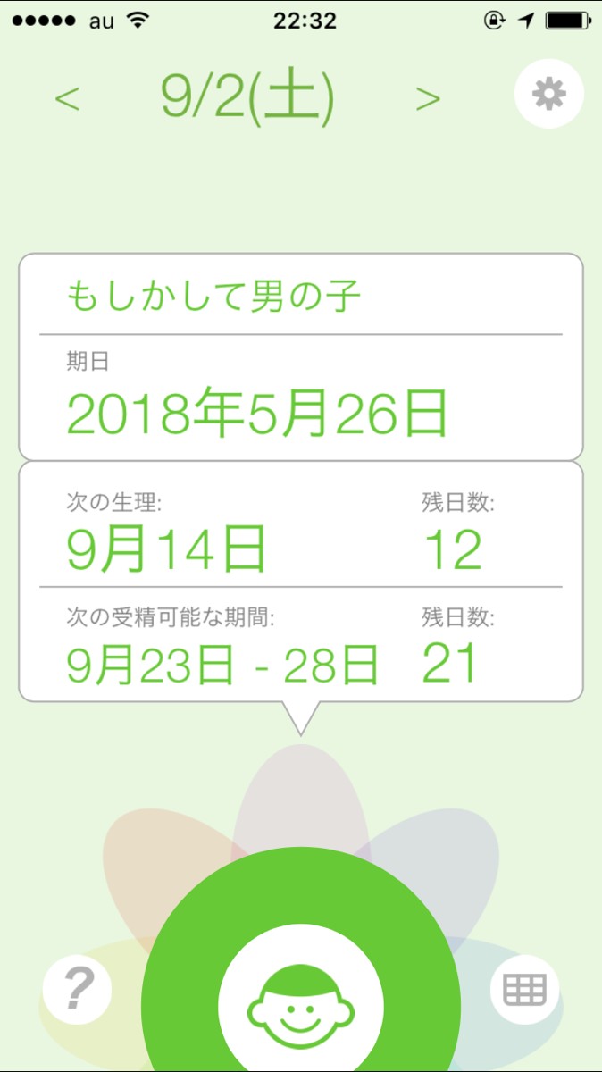 ・カレンダーには「生理の期間」「受精可能期間」「受精の可能性のない期間」「排卵日」などを色分けして表示してくれます。次の生理予定日も教えてくれます。受精可能期間は、女の子が生まれやすい日には女の子の顔が、男の子が生まれやすい日には男の子の顔が表示されているので、産み分けをしたい人には参考になるでしょう。
