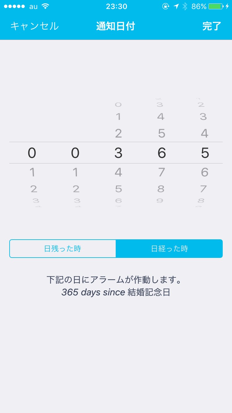 アラーム通知をONにすると、記念日の何日前、または何日経った時に通知するかの設定を行うことができます。