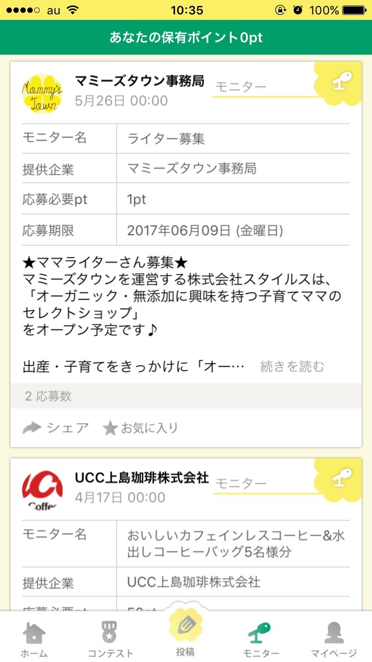 ポイントが貯まると、ママと子ども向けの食料品や衣料品、ママ向けのお仕事など複数のモニターへ応募することができます。