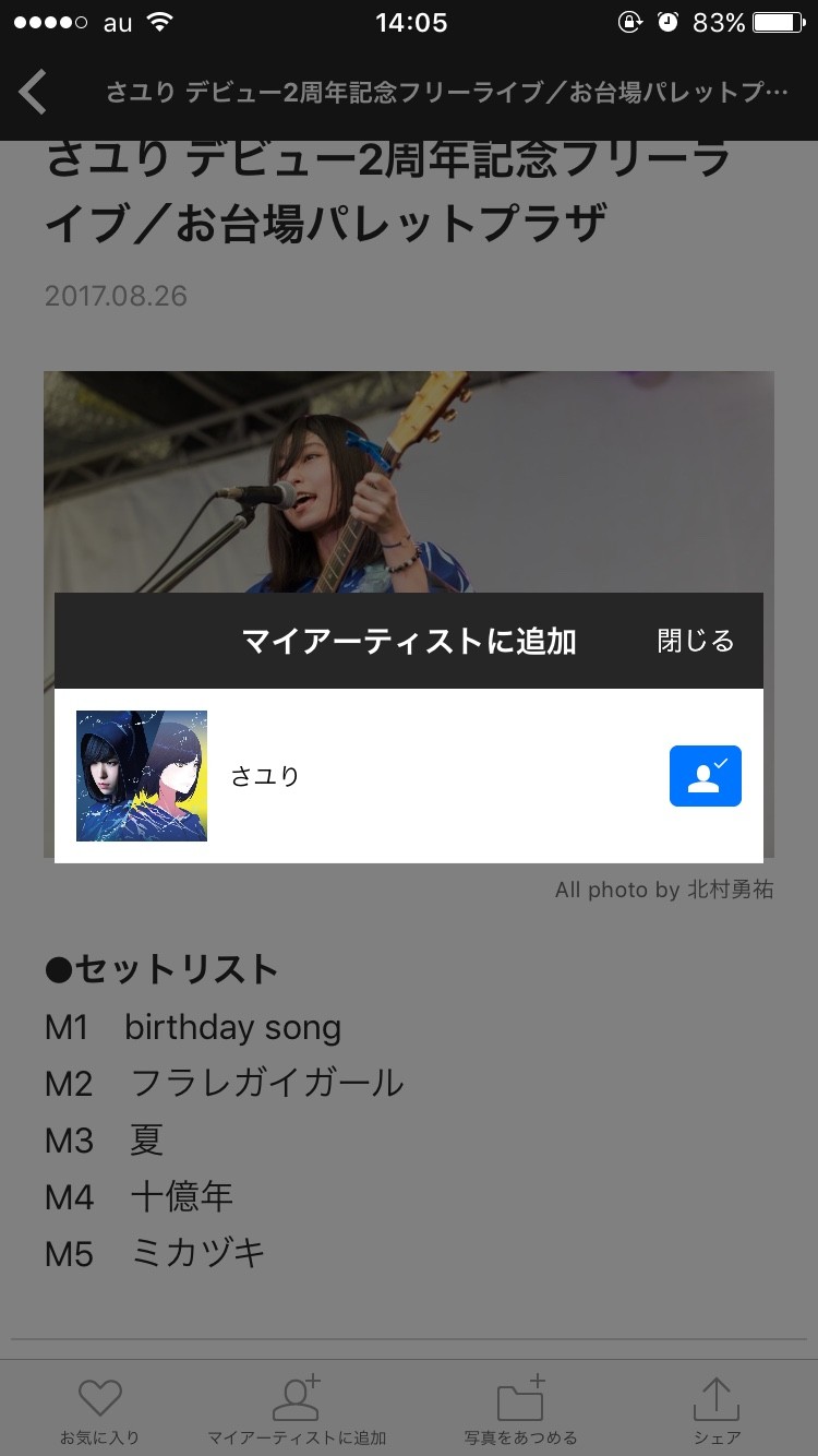 記事を開くと下部のタブが変わり、お気に入り、マイアーティストに追加、写真をあつめる、シェアの4つになります。