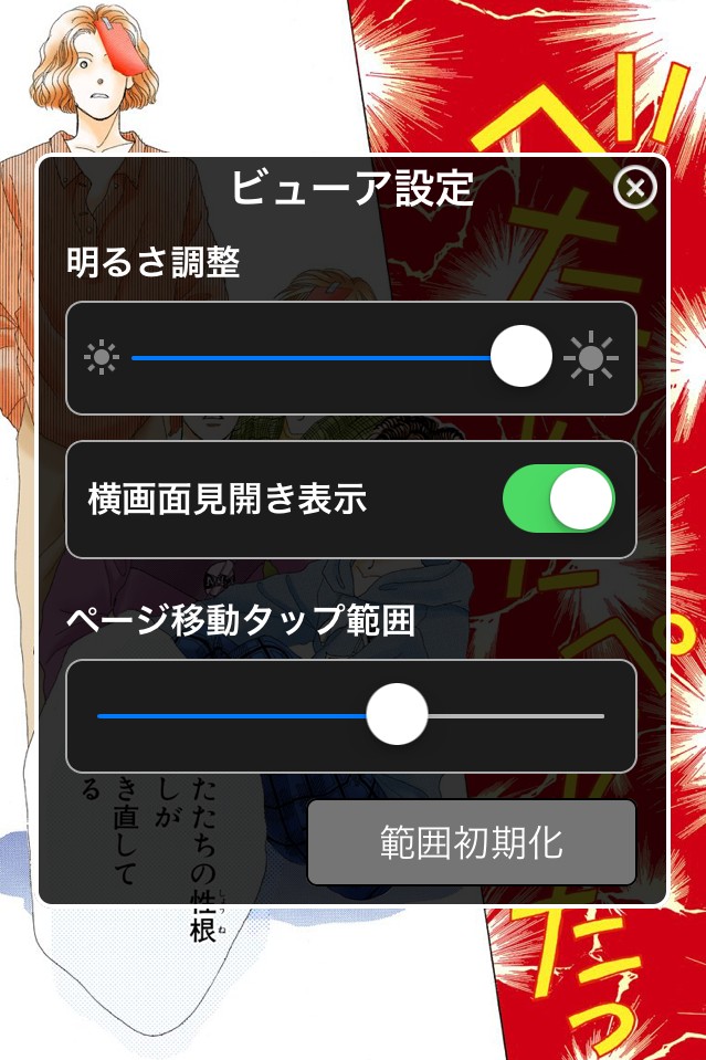 明るさや横画面見開き表示の有無、ページ移動タップ範囲(画面左右)の設定を調整することができます。