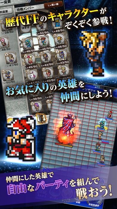 日本の国民的RPG「FINAL FANTASY」。本作ではそんなFFシリーズのタイトル(ナンバリングタイトルI~XIVとTactics)に登場したキャラクターを仲間にして白熱のバトルを繰り広げましょう!