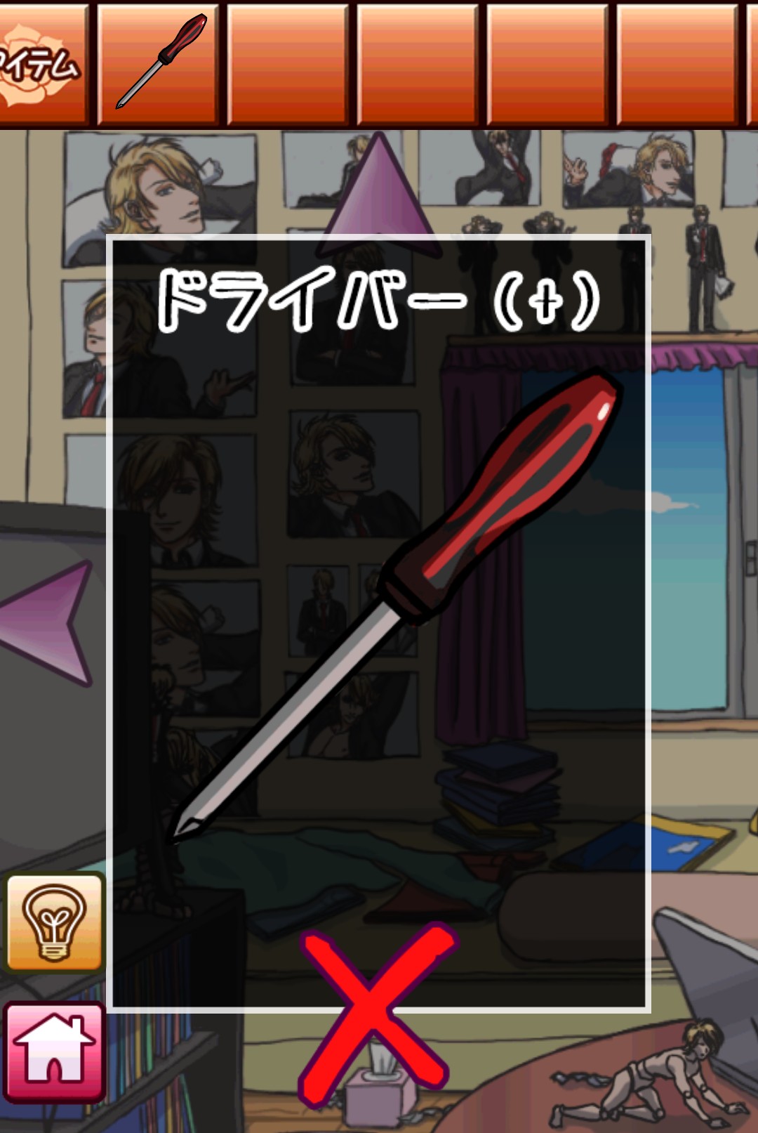 ポスターだらけに見える腐女子部屋の中には、人形やドライバーティッシュなど色々なものが落ちています。アイテムらしい物体を見つけたらとにかくタップしていくと、この先に必要なアイテムやヒントが出てくるので、まずは【ドライバー】を探してみましょう。