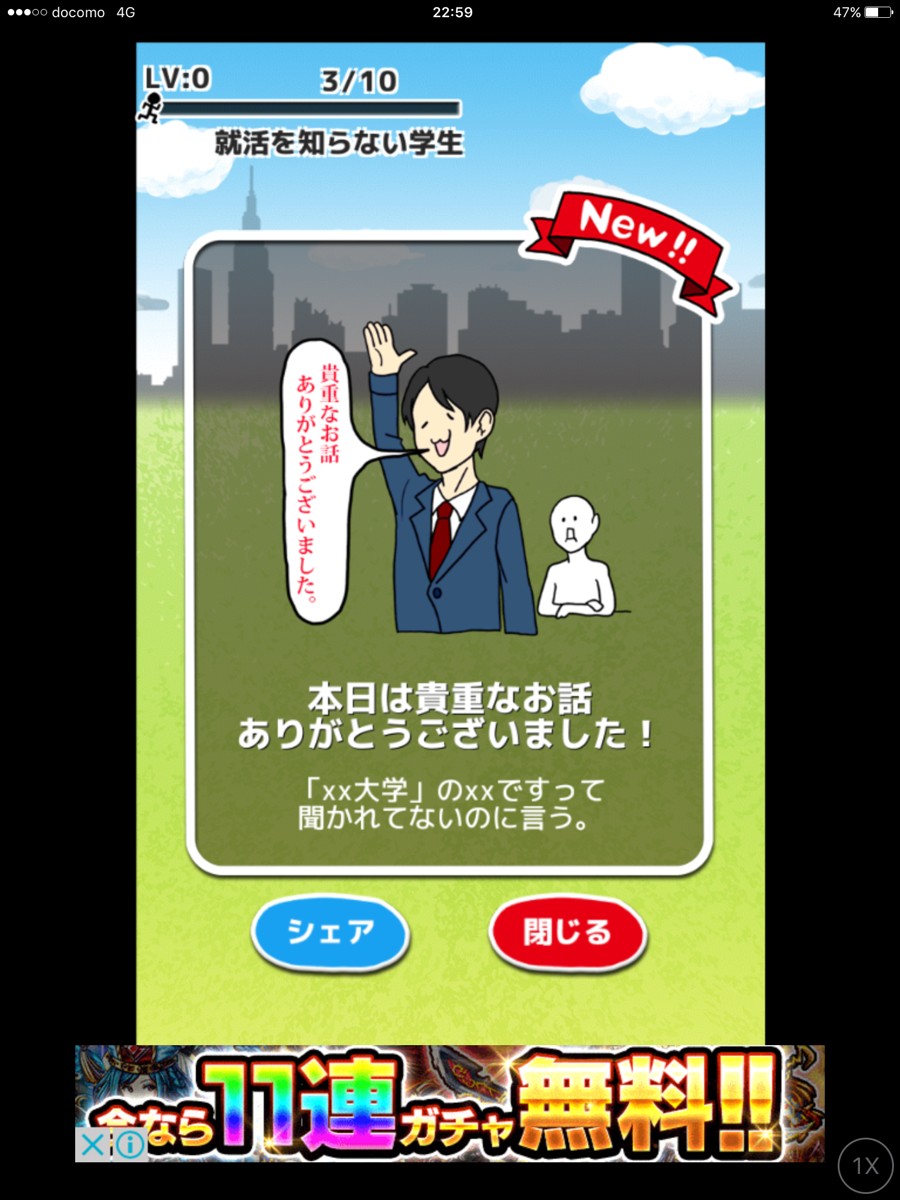 就職するために皆さんはどんな準備をしているでしょうか。マナーはもちろんのこと就職を希望する会社の情報集めをしているかと思います。そんな就職の準備に役立つアプリが永遠の0内定です。就職におけるあるあるネタをコレクトするゲーム内容となっています。就職のあるあるを事前に知っておくことで、マナー意外にもこんな失敗があるのだと気づかせてくれる心強いアプリでもあります。自分を見つめ直すことにも使えるので、就活がうまくいかず焦っているという方にもお勧めします。時には一度立ち止まって何がダメなのか、再確認することも必要です。また笑えるあるあるネタもあるのでちょっとした息抜きに楽しむ使い方もするといいでしょう。焦らず急がず心にゆとりを持つことも大切です。