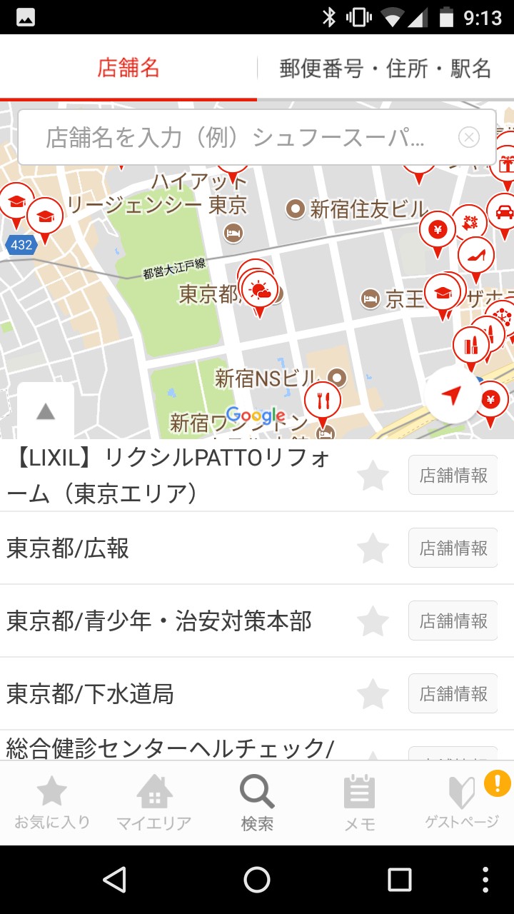 店舗の名前をド忘れした時や、目的地に近い店舗を探したい時、使うと便利なのが検索機能です。画面の上半分は地図と店舗所在地にピンが立った地図が、画面の下半分には地図エリアの店舗一覧が掲載されています。
