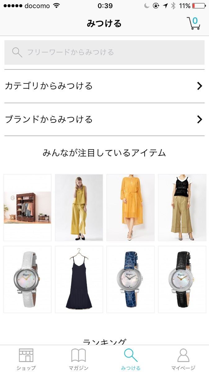 カテゴリ検索とブランド検索の2種類が選択可能。またみんなが注目しているアイテムや、売れ筋ランキングも確認することができます。いまどんなファッションやアイテムがトレンドなのかもこの機能を使えばチェックできちゃいますね。
