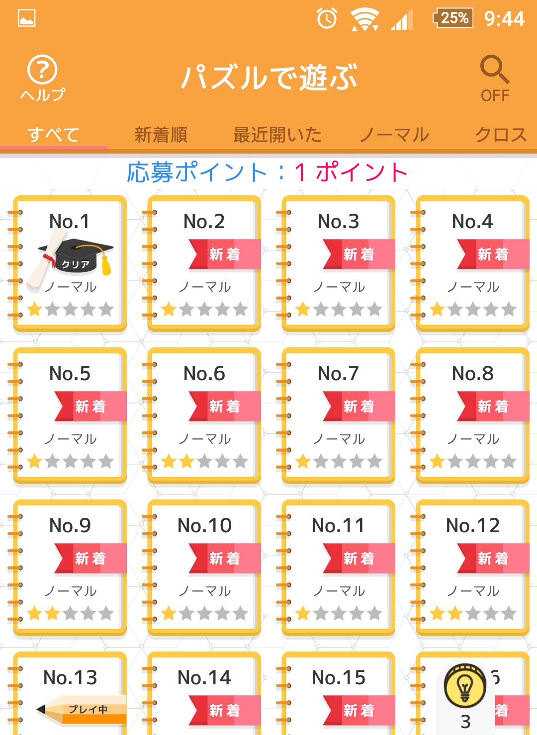 難易度の高いナンプレをクリアするほど手に入る応募ポイントが増えるので、パズルに慣れてきたら難易度を上げてナンプレを楽しんでいきましょう。