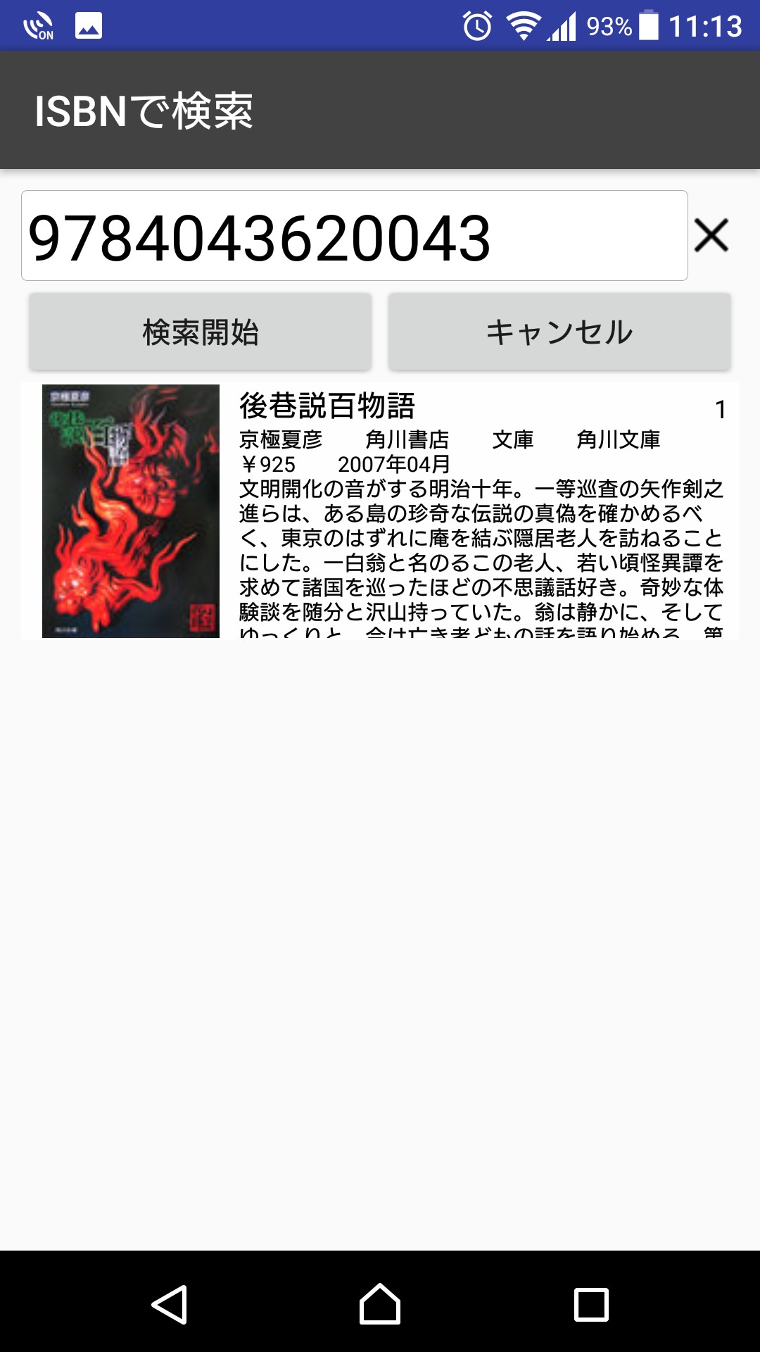 登録する本を検索するには、「カメラでバーコード」「ISBNで検索」「WEBで検索」「手入力」の4つの方法があります。これだけでもうかなり便利です。今回は試しに筆者手持ちの本のISBNを入力してみました。正しく入力すると、上の画面のように、登録したい本が表示されます。タップして詳細を確認し、必要ならば「状態」等の編集を行って、「登録」をタップすれば登録完了です。すぐに購入したいという場合は、登録画面から「楽天」をタップすると楽天ブックスの販売ページに移動することができます。