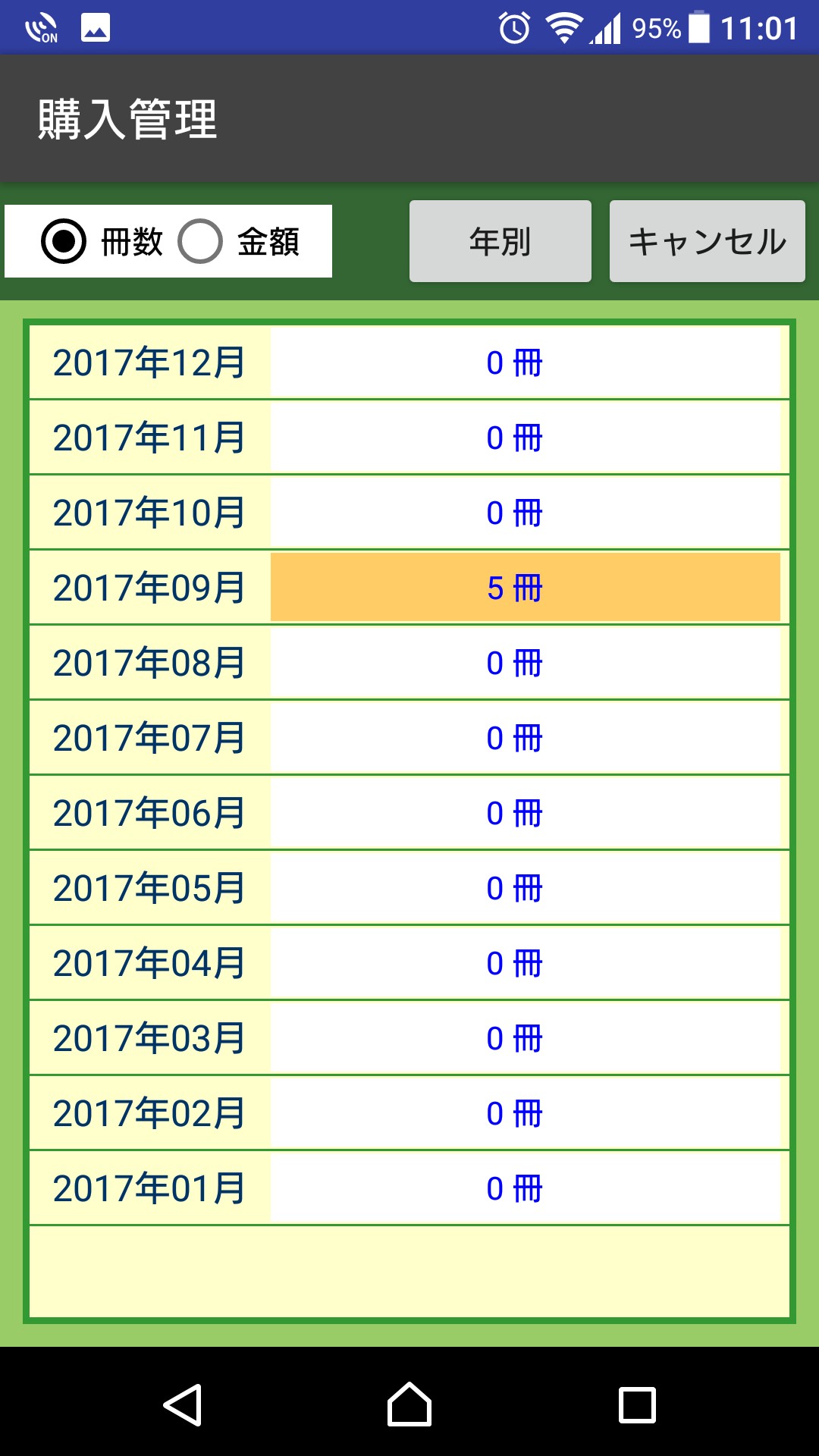 「購入履歴」は「状態」を「購入予定」にしたものが表示対象になります。冊数と金額で一覧を切り替えることができます。
