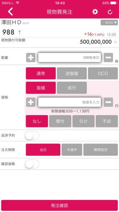 3.銘柄検索をして注文した銘柄を表示させ、注文をタップします。注文方式、市場、発行株数、執行条件を選択し確認後、執行パスワードを入力して注文します。株式注文照会で行った株取引の確認が可能です。