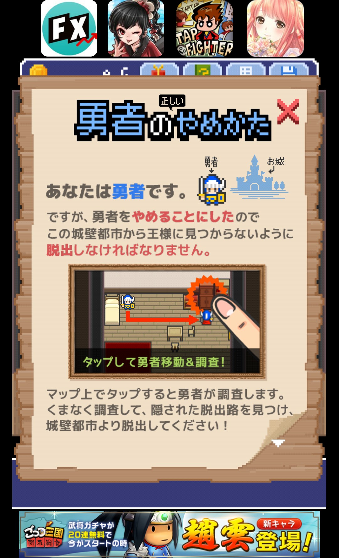 脱出ゲーム「あいつ勇者やめるって」』は、ロールプレイングゲーム風味の脱出ゲームです。ロールプレイングゲームのようにタップした場所に勇者を移動させていろいろな場所を探検できます。