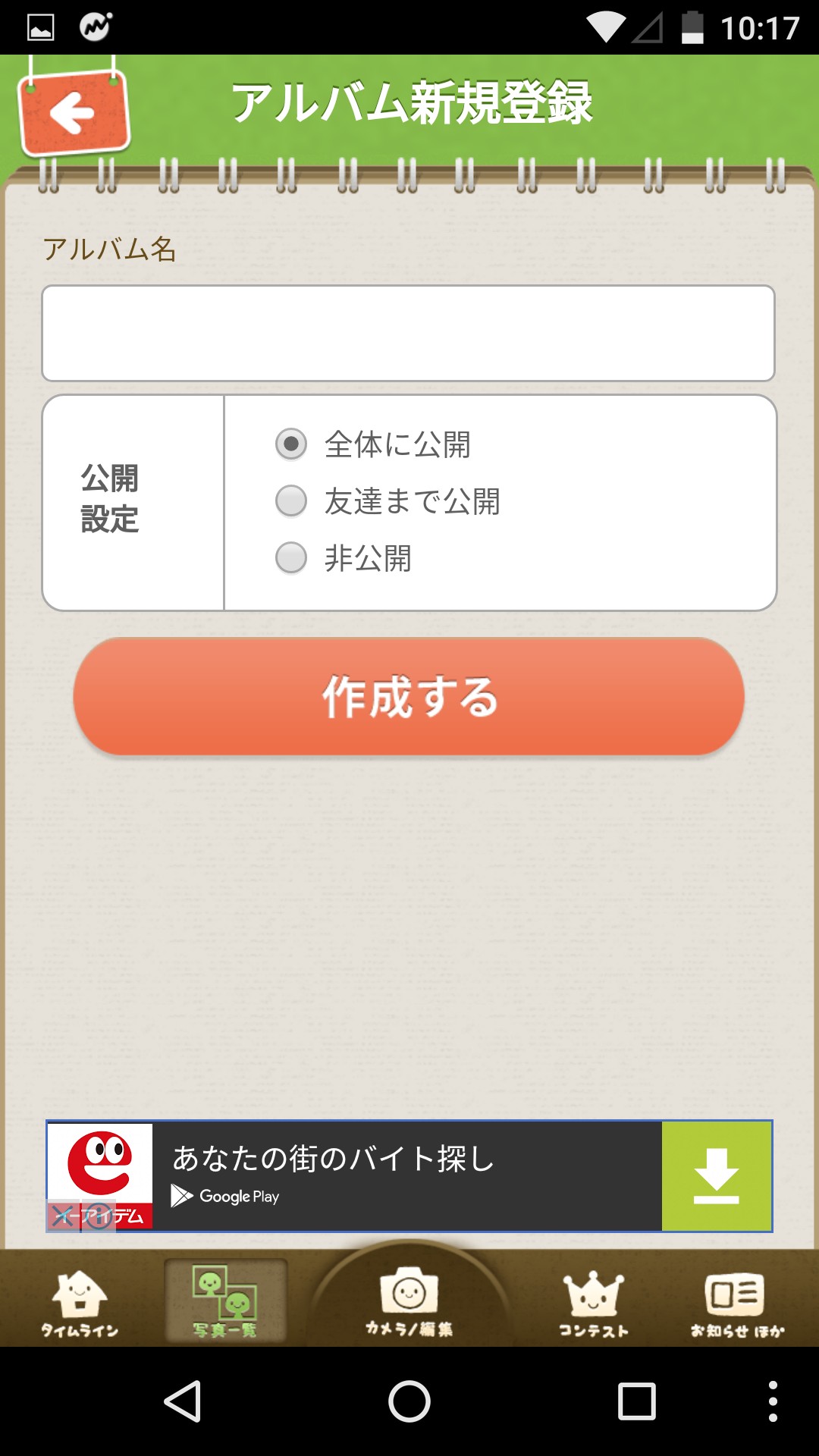 ○新規アルバムを作成して、アルバム名登録、子供名、公開範囲を登録します。