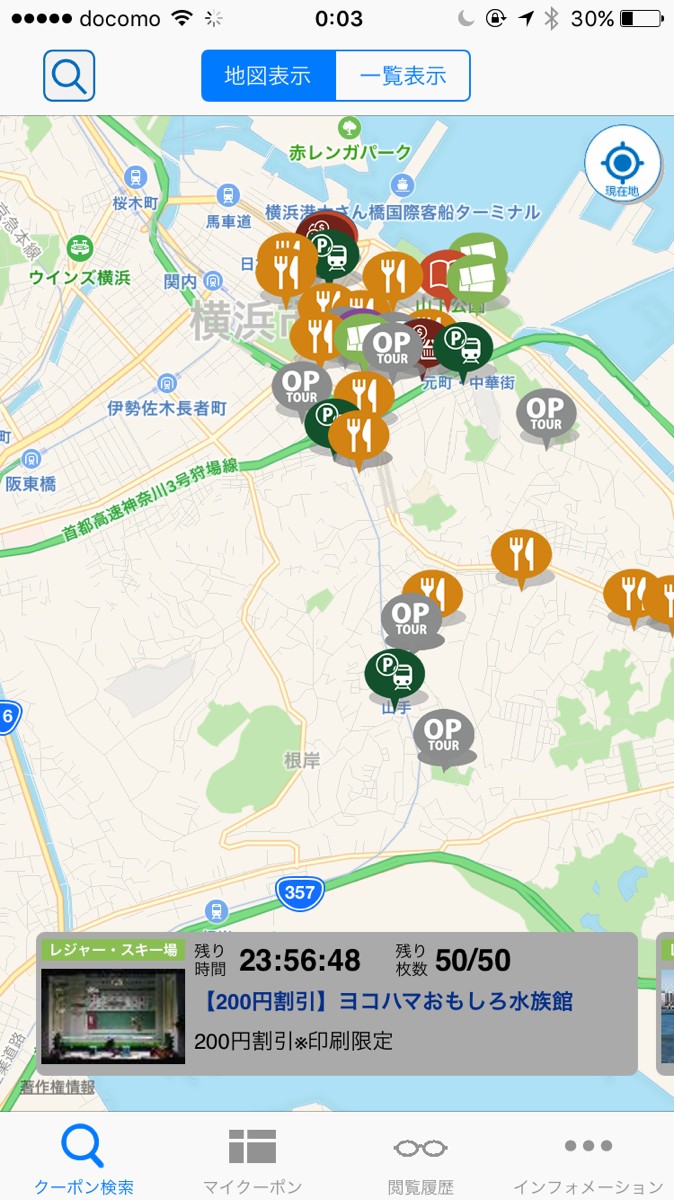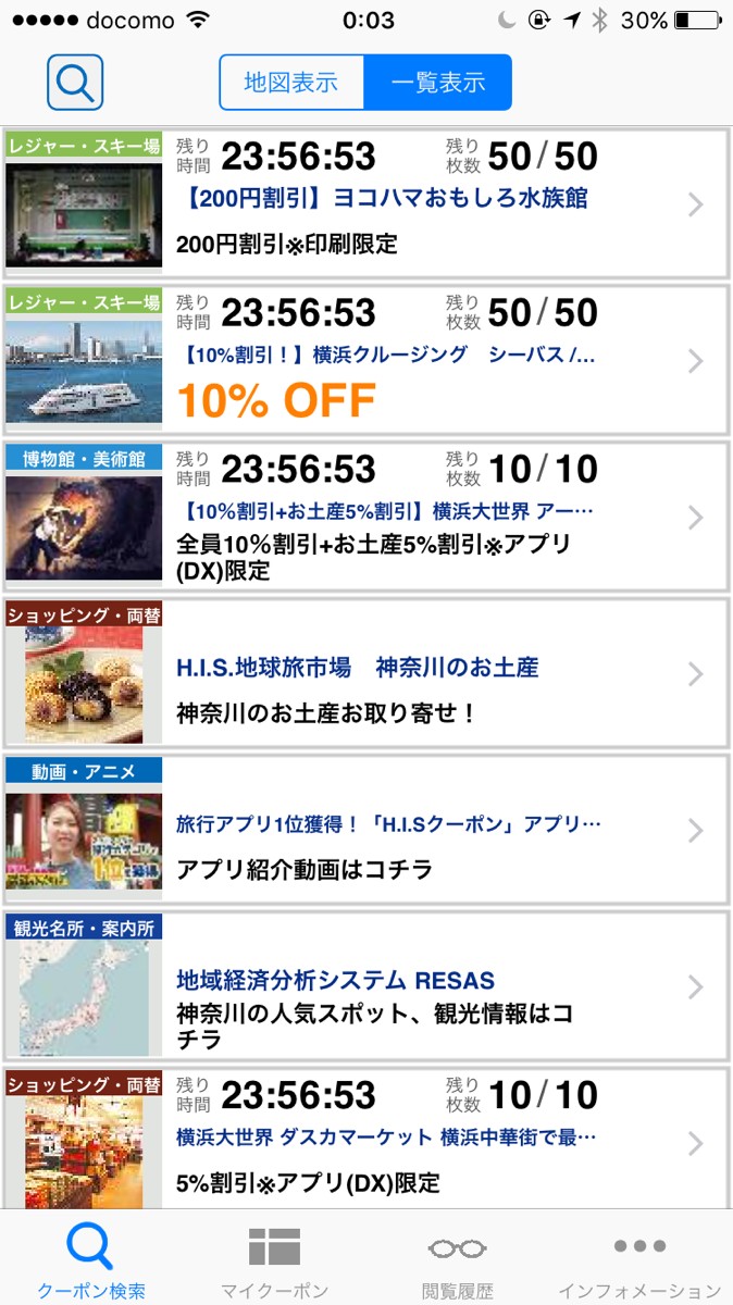 地図からの情報検索だけでなく、掲載情報をリスト一覧から探すことも可能です。週末の予定が未定のときに掲載情報をもとに決めてみたり、ちょっとした空き時間にどんなクーポンがあるのか確認してみるのもいいですね。