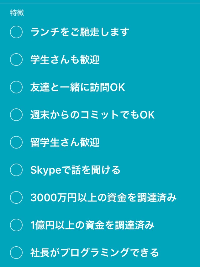 ちなみに面白いと思った求人検索が「ランチご馳走します」や「3000万円以上の資金を調達済み」、「1億円以上の資金を調達済み」、「社長がプログラミングできる」、「社長が20代」といった特徴からの検索です。