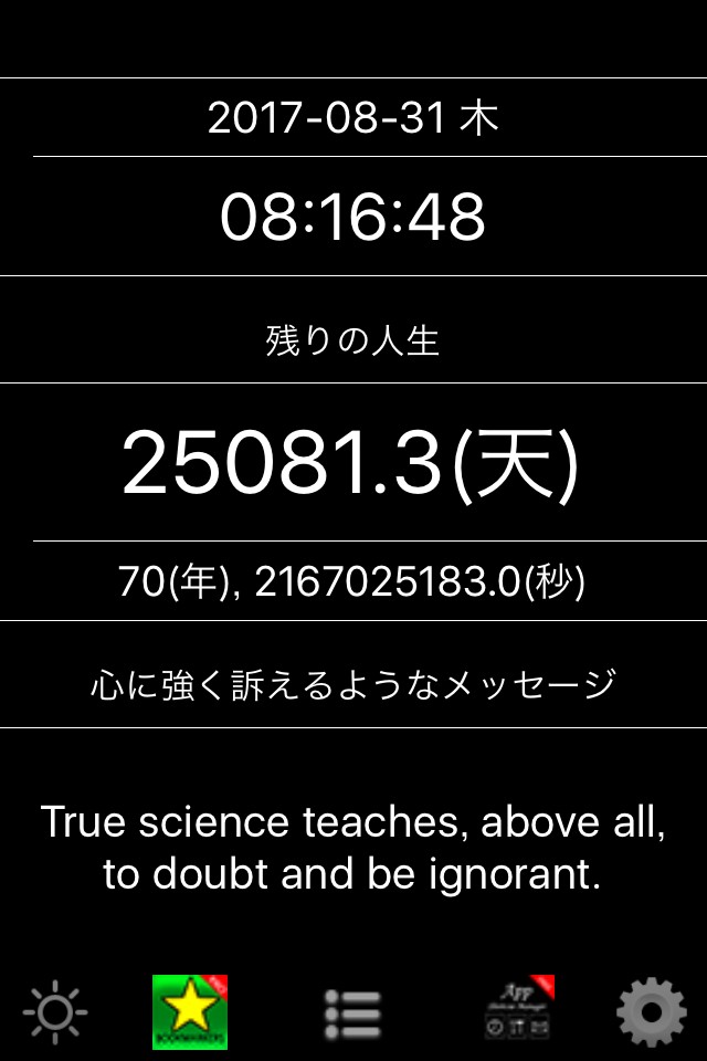 人生の残り時間を表示し、人生についての名言を収録したアプリ「生命を鼓舞」をどう使うかは、インストールしたユーザー次第です。なんの役に立つのか。正しい使用方法とはなんなのか。それらの答えはすべて自分自身でしかわからないでしょう。それでも「生命を鼓舞」に興味を持てたのなら、つらいことやかなしいことがあったときにアプリを起動してみてください。ほんの少しこころが軽くなるかもしれません。