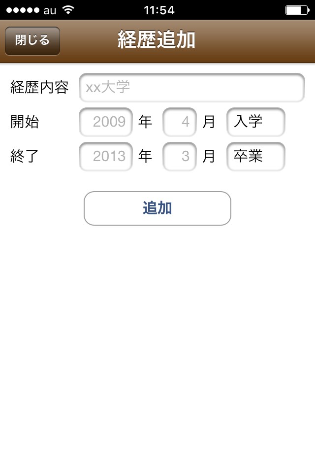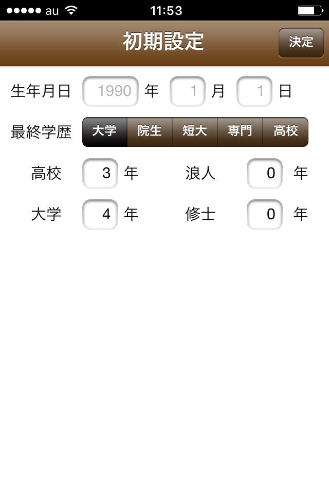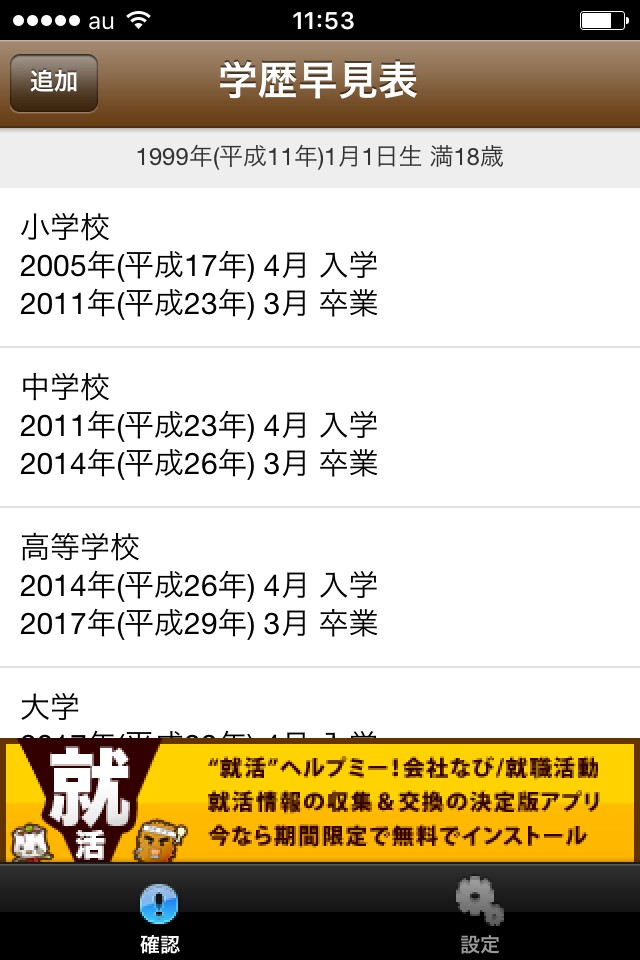 アプリ「学歴早見表!ES・履歴書簡単作成!」は生年月日の入力後、浪人分や大学院の経歴を追加することも可能です。さまざまな理由から在学年数が伸びてしまった人でも、そのままアプリを活用することができますね。