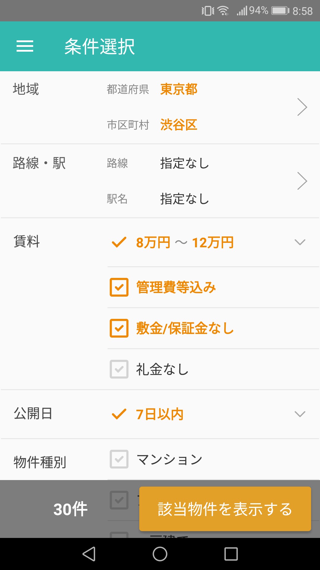 大まかな検索だけですと、自分が希望している条件の物件ではないものまで表示されてしまいます。ここで「条件選択」機能を利用して、絞り込んでいきましょう。