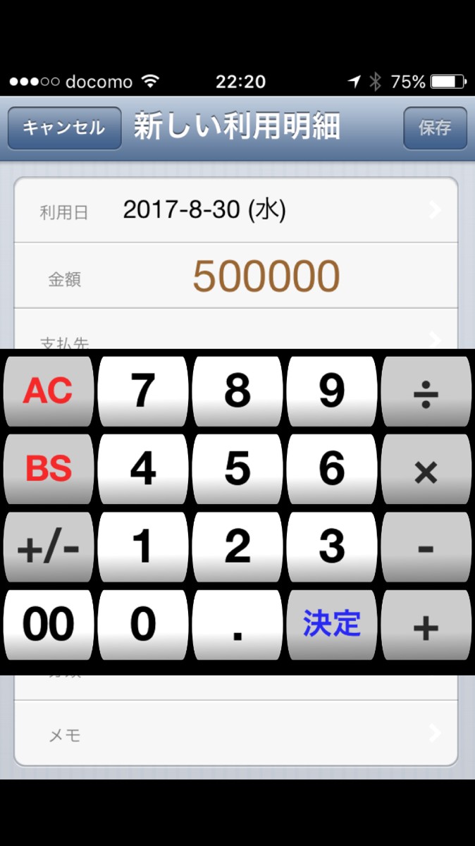 ・「クレメモ」画面に戻って「新しい利用明細」をタップ