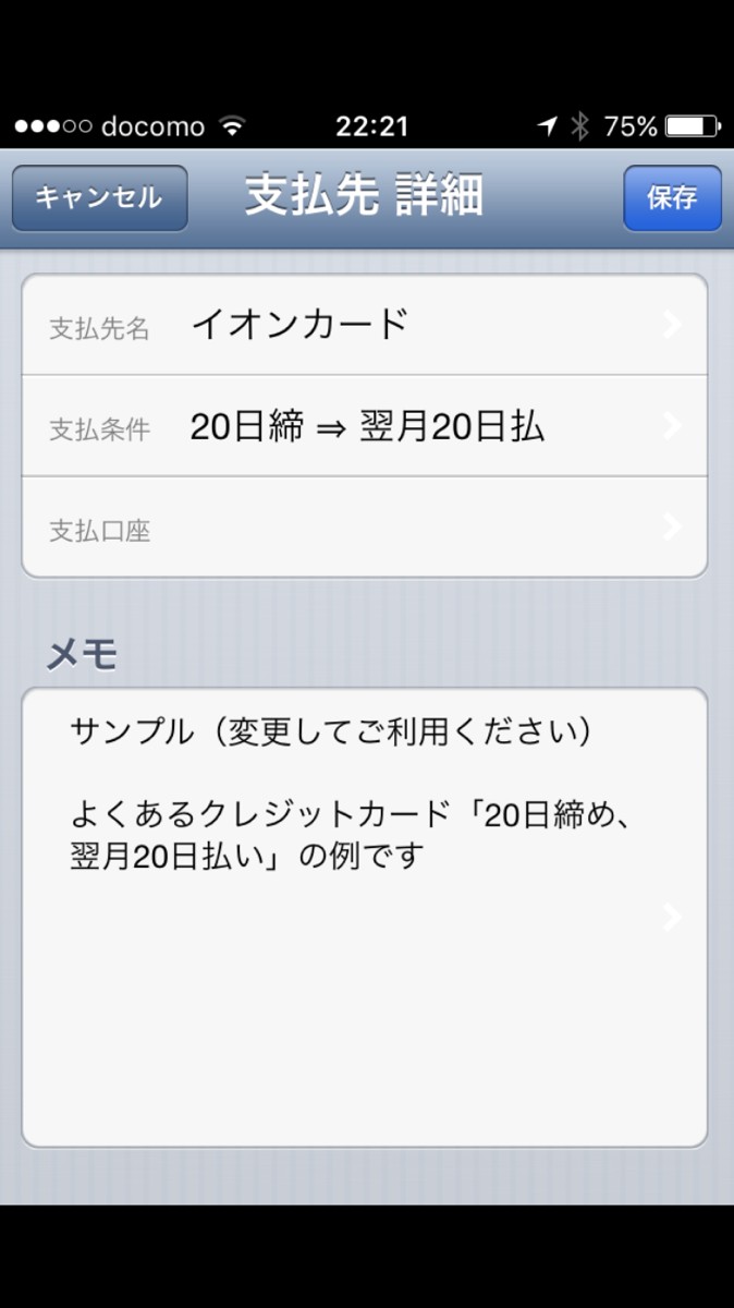 ・「支払い先詳細」画面にて、使用しているクレカの名前や締め日、支払い日を入力します