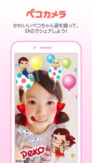 「ペコカメラ」は、不二家から配信されている無料の公式写真加工アプリです。「ペコカメラ」はアプリに顔を映し出すと、AR技術によって顔のパーツを検出してペコちゃんに変身したり、ミルキーをモチーフにしたクラウンをかぶったり、ポップキャンディをなめている犬になりきった写真を撮影できるようになっています。カメラにはあらかじめ美白補正機能やデカ目補正機能が付けられており、自動で修正してくれるので自分で補正をする必要もありません。そのため、自分の顔をどのように加工していったらいいか分からない初心者にも使いやすく手軽に不二家のキャラに変身した気分を味わうことができます。
