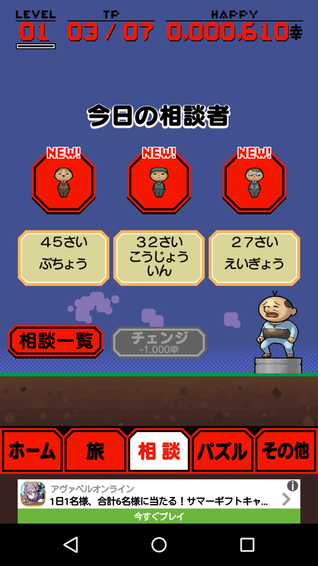 ゲームは4つのことを行い、「倒産力の幸せにする力」をためて悩む人々を幸せにすることが目的です。操作が簡単ですし、時間もとられないので気軽にプレイしてみましょう。