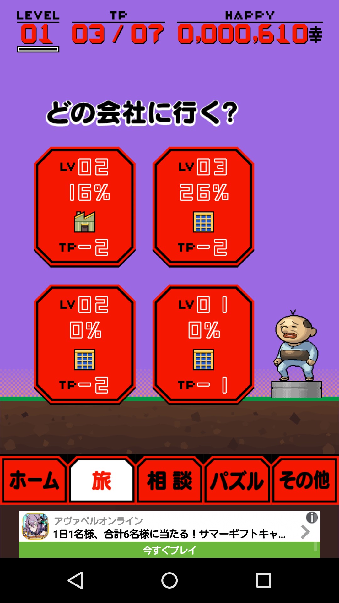 「旅」の画面では最大で4つの会社を巡ることになります。TP(倒産ポイント)を消費して会社のレベルと%を成長させ、倒産させやすい会社にしたところで倒産力を使い倒産させましょう。