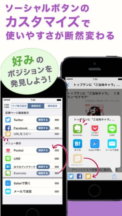 さらに、自分の興味があるジャンルのニュースを自動で集めてくれるので、忙しい人にもピッタリです。SNSなどシェアボタンも自分の好みにカスタマイズができます。
