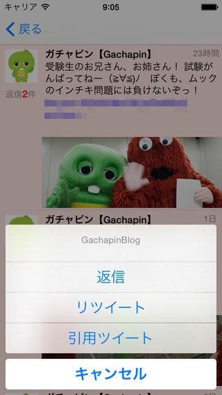 ・未読件数のついたフォローを選択すると、ツイート画面のツイートに色がついて未読分がわかります。また、そのツイートに対する「返信件数」が分かります。さらに返信件数をタップすると返信のツイートを見ることが出来ま す。ツイート本文をタップすると返信、リツイート、引用ツイートが出来ます。