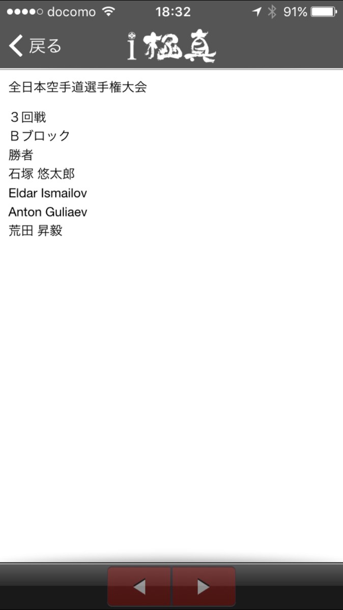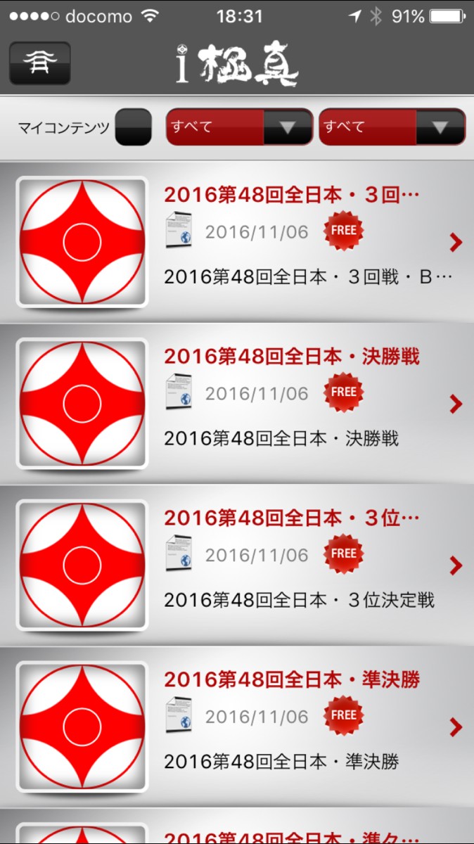 ・「コンテンツ」をタップすると、過去の空手大会の動画や結果が見れます