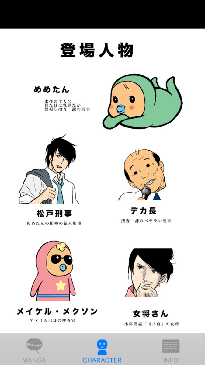 キュートで赤ちゃんにしか見えない風貌のめめたんは、なんと警視庁捜査一課の新人刑事。神出鬼没で予測不能な捜査で、相棒の松戸刑事とともに数々の難事件を解決していきます。クセのある登場人物が、じわじわとあなたのツボにハマっていきますよ!