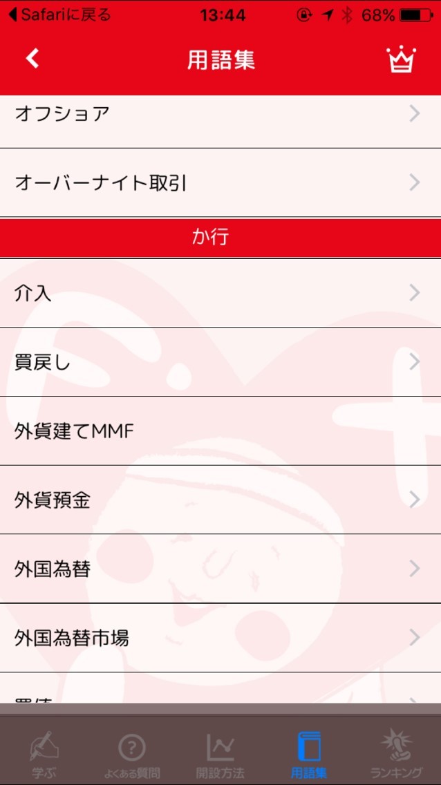 FXに関する用語集です。辞典のようにあいうえお順に並んでおり、調べたい単語を探しやすいです。このアプリでは約150の用語について解説しています。実際にトレードをしているときや経済記事を読んでいるときに、ふと気になった用語を簡単に調べることができます。