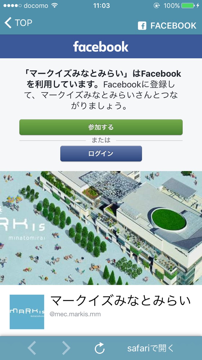 ホーム画面にある「公式Facebook」をタップすると、マークイズみなとみらいの情報を確認することができます。更新頻度も高いので、新規ショップ情報やイベント情報、新作アイテムに関する情報などを楽しめます。