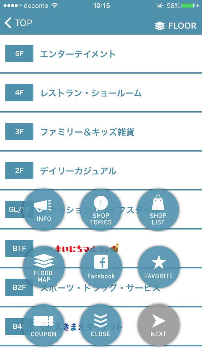 アプリのホーム画面には「インフォメーション」「ショップトピックス」「イベント情報」「公式Facebook」の4つのカテゴリーが表示されています。ひとつひとつのカテゴリーが大きく表示されているのでとても見やすく、必要な情報をさっと開けます。