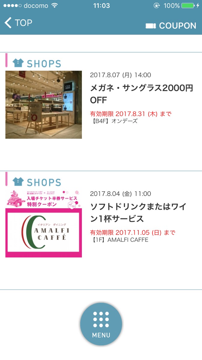 ショップトピックスをタップすると、各ショップのセール情報などが一覧で表示されます。画面をスワイプすれば、各ショップの情報を見ることができます。